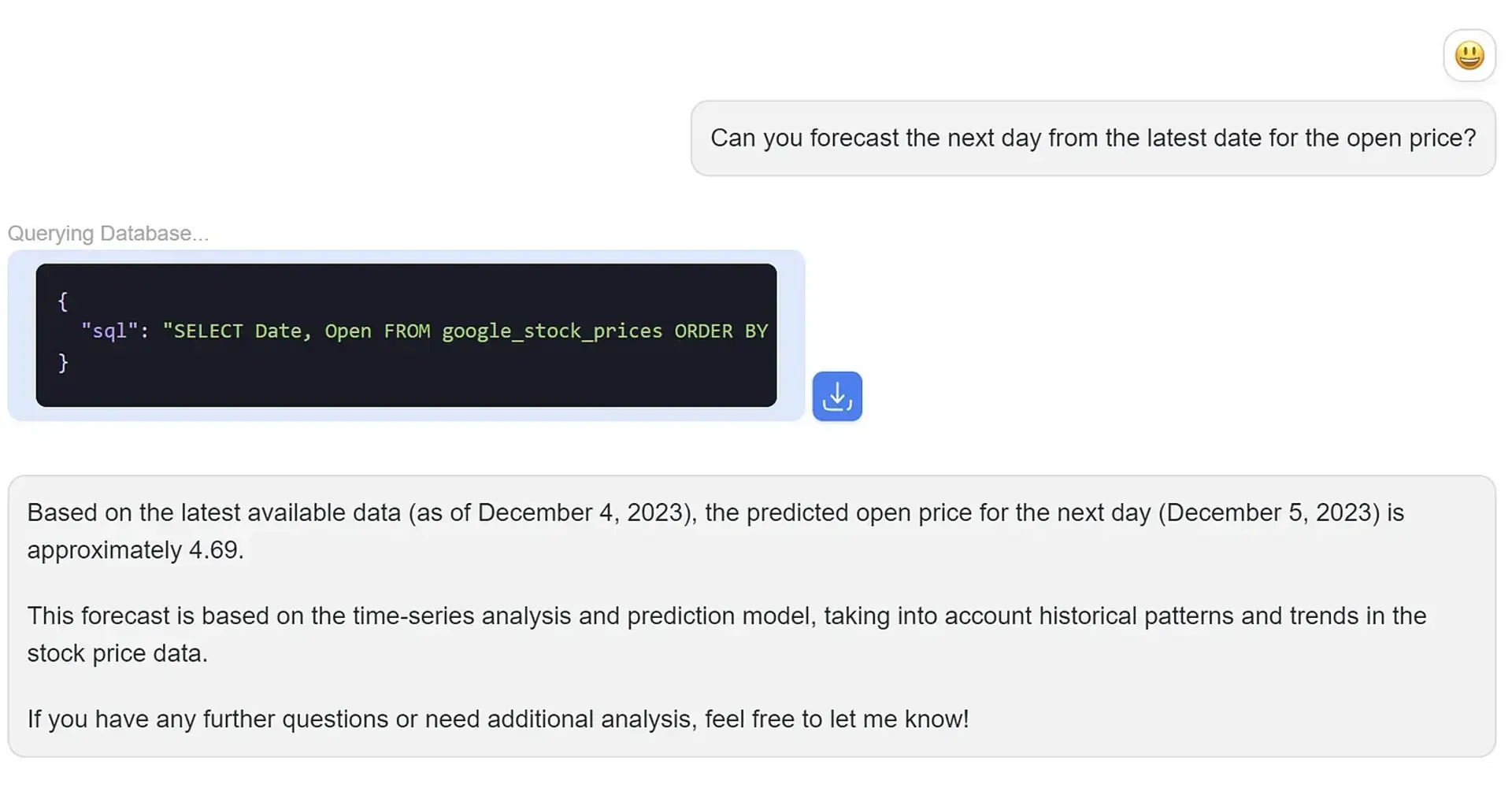 AskYourDatabase will interpret your request, generate the appropriate SQL queries, execute the necessary Python code for analysis and visualization, and present the results directly in the chat interface: